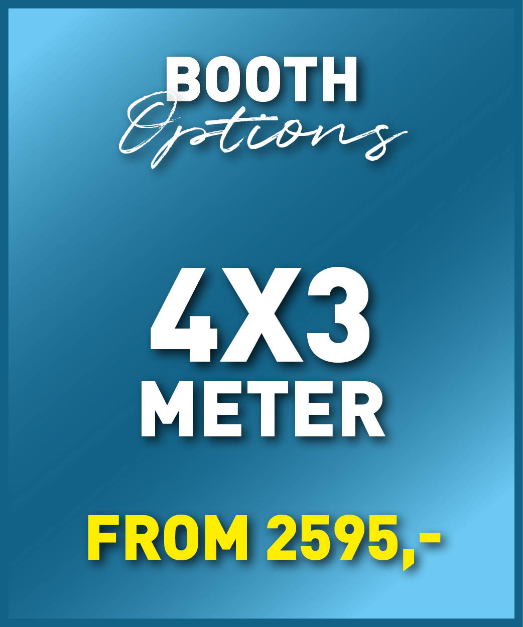 Hier zijn een groot aantal stands beschikbaar. Ze zijn aangegeven in een blauwe (4×3 meter) of groene (5×4 meter) kleur op de plattegrond. Hieronder vind je meer informatie. Prijs is 2595,- en 3295,-