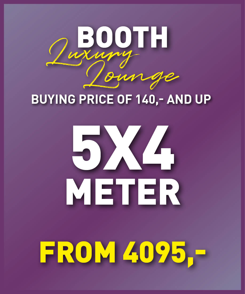 Wegens de exclusieve meubels hebben we hier een zeer beperkt aantal stands van beschikbaar. Ze zijn aangegeven in een paarse kleur op de plattegrond. Hieronder vind je meer informatie. Prijs is 4095,-