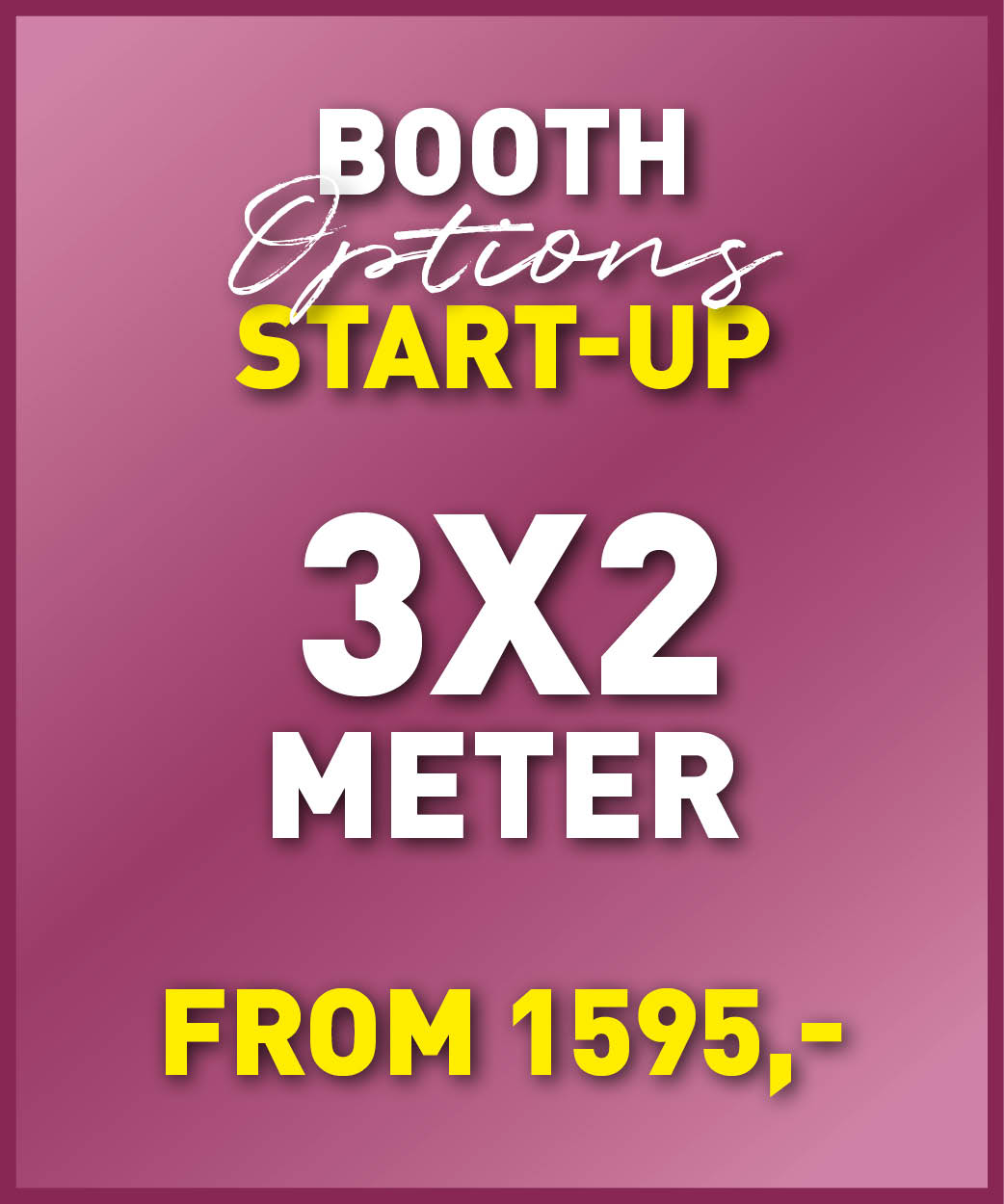 Van de start-up stands zijn maar een beperkt aantal beschikbaar. Ze zijn aangegeven in een roze kleur op de plattegrond. Hieronder vind je meer informatie. Prijs is 1595,-