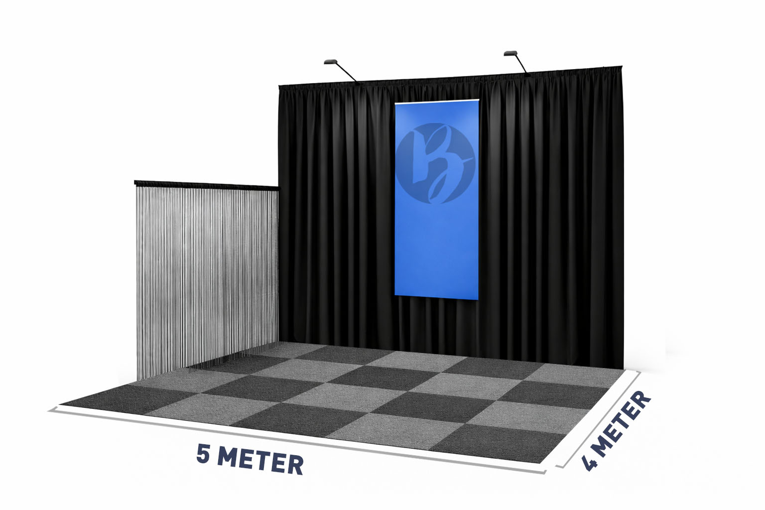 • Achterzijde van zwart plisségordijn van vier meter hoog. • Alleen de kop stands hebben geen zijwanden, tussen gelegen stands hebben een scheidingswand van zwart spagettikoord gordijn, let op: het is niet toegestaan de zijwanden dicht te maken. • Inclusief twee LED-lampen (+ stroom voor de verlichting, niet voor eigen gebruik).