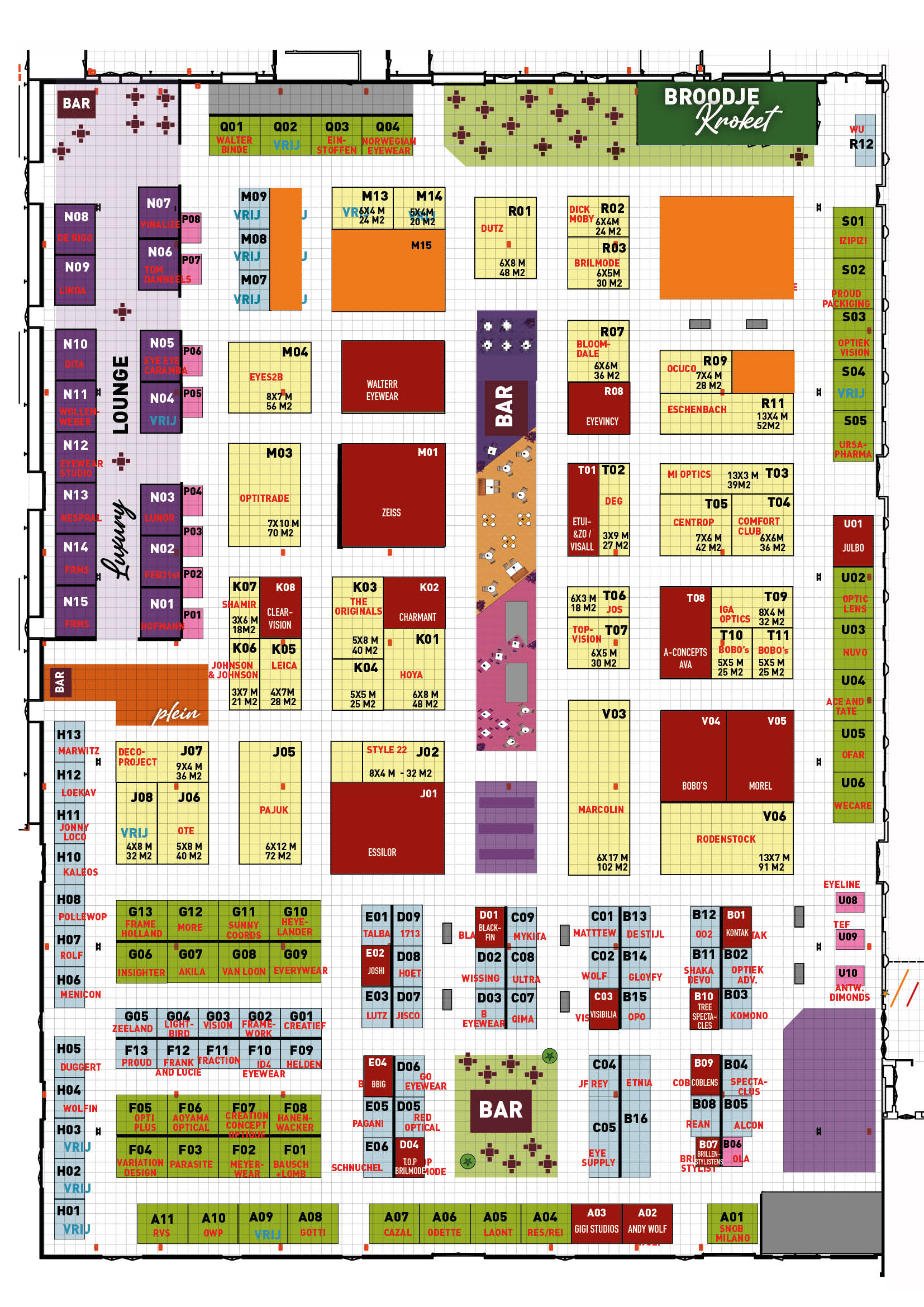 Roze stands zijn voor startende merken en optiek gerelateerde bedrijven. Blauw of groen voor een standaard stand (zonder meubels), Paars is de Luxury Lounge (met meubels) voor het hogere segment merken (volledig ontzorgd), geel is voor Space Only waarbij je zelf je stand bouwt.