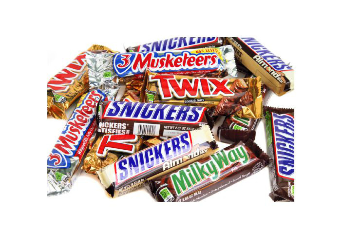 Wisselend assortiment, kan bestaan uit bijvoorbeeld: Mars, Snicker, Twix, M&M’s, Balisto. (Afbeelding is ter illustratie, assortiment kan afwijken van het getoonde beeld.)