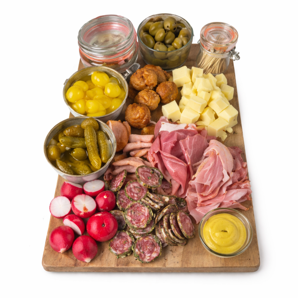 Laat potentiële klanten genieten of geniet samen met uw collega’s van deze lekkere happen geserveerd op een gedecoreerde schaal. Dit item bevat: Gehaktballetjes, Fuet, Mozzarella, Manchego, Prosciutto, Olijven, Notenmix, Peppadews, Broodstokjes met pesto roomkaas. (Afbeelding is ter illustratie, assortiment kan afwijken van het getoonde beeld.)